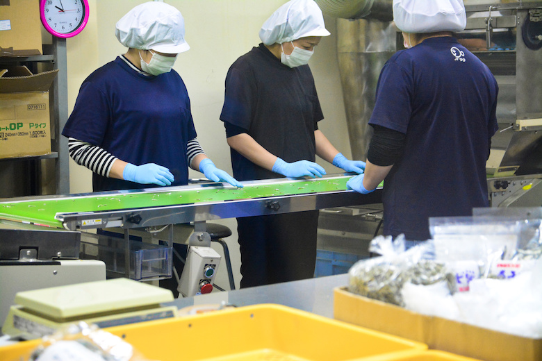 乾燥後、機械で異物などを除去し、更に、人の眼で再度異物や他の魚が混入していないか確認・除去を行います。